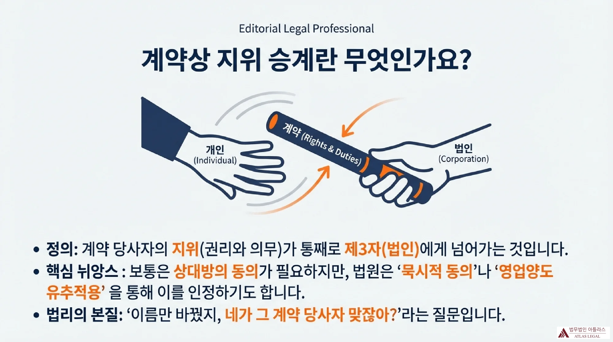 계약상 지위 승계란 계약 당사자의 일방이 그 계약에서 발생하는 권리와 의무 전부를 제3자에게 이전하는 것을 말합니다. 승계가 이루어지면 새로운 당사자(법인)가 기존 당사자(개인사업자)의 지위를 그대로 인수하여 계약상 권리를 행사하고 의무를 부담하게 됩니다.
