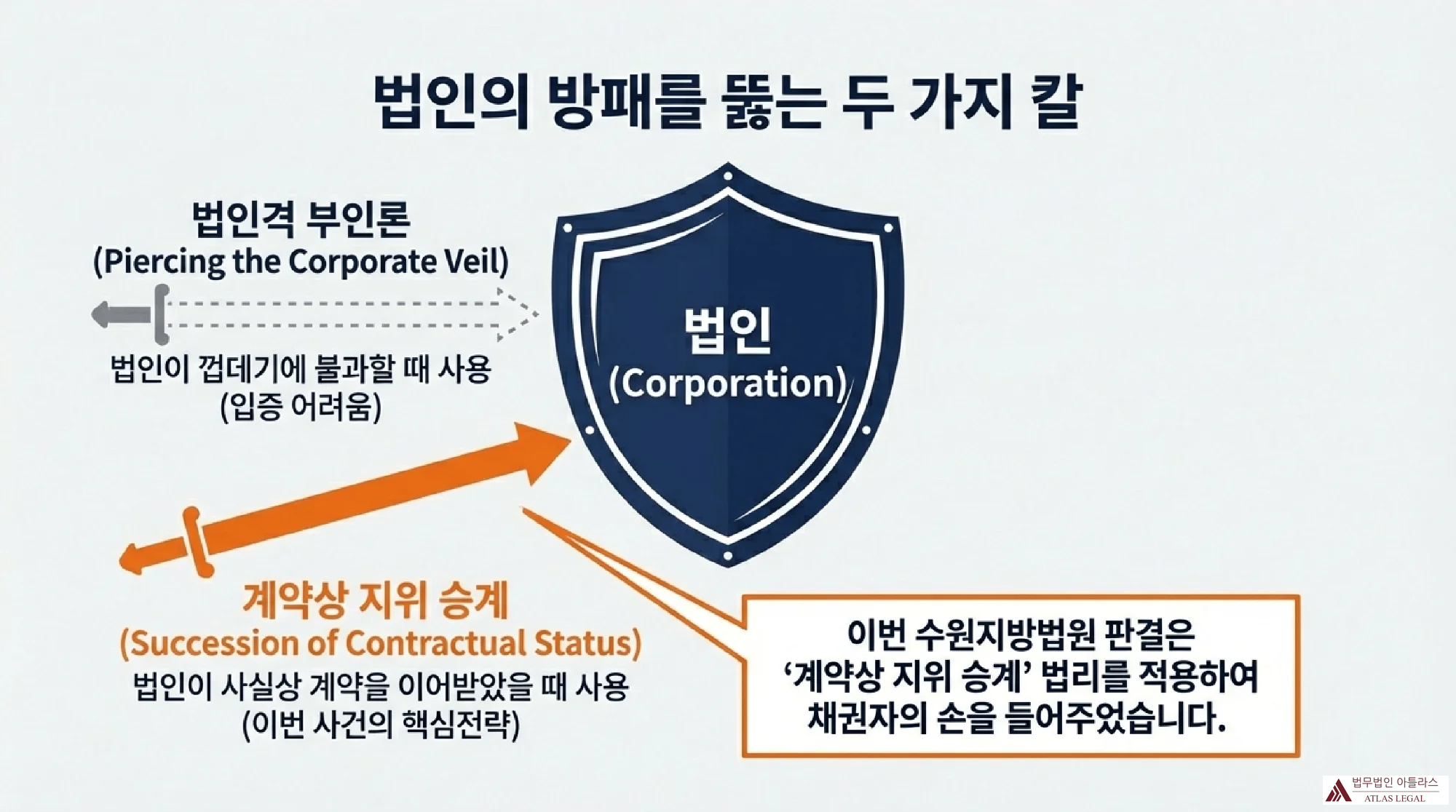 법인격 부인론은 법인과 그 배후자(개인)를 동일시하여 개인에게 직접 책임을 묻는 법리입니다. 반면 계약상 지위 승계는 계약관계가 개인에서 법인으로 이전되었다고 보아 법인에게 책임을 묻는 것입니다. 이 사건에서 법원은 법인격 부인론이 아닌 계약상 지위 승계 법리를 적용했습니다. 즉, 개인사업자의 임차인 지위가 법인에게 승계되었으므로 법인이 임대료 지급 의무를 부담한다고 판단한 것입니다.