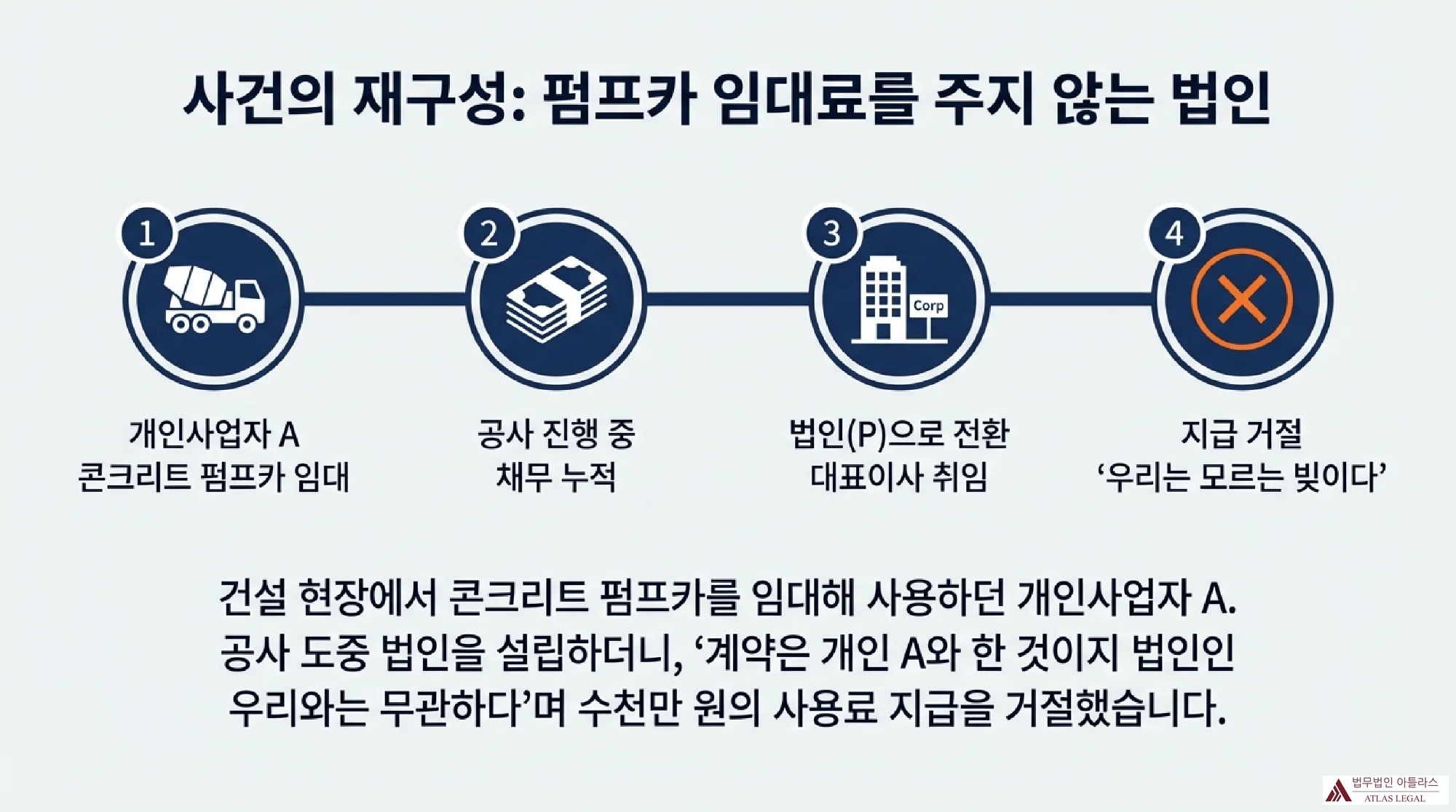 그런데 A는 공사가 진행 중이던 시점에 법인을 설립하고 대표이사에 취임했습니다. 법인 설립 이후에도 동일한 현장에서 동일한 펌프카가 계속 사용되었습니다.