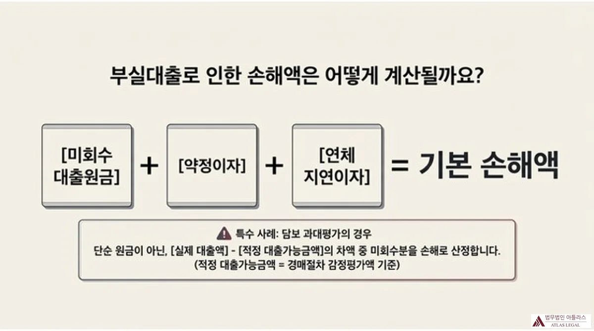![Atlas Legal - 부실대출 손해액 계산 공식 (미회수원금+이자+연체이자) 부실대출로 인한 손해액 계산 공식: [미회수 대출원금] + [약정이자] + [연체 지연이자] = 기본 손해액. 특수 사례(담보 과대평가의 경우): 단순 원금이 아닌, [실제 대출액] - [적정 대출가능금액]의 차액 중 미회수분을 손해로 산정(적정 대출가능금액 = 경매절차 감정평가액 기준).](https://atlaw.kr/kr-blog/wp-content/uploads/sites/2/2026/04/fl20260406-04.webp)