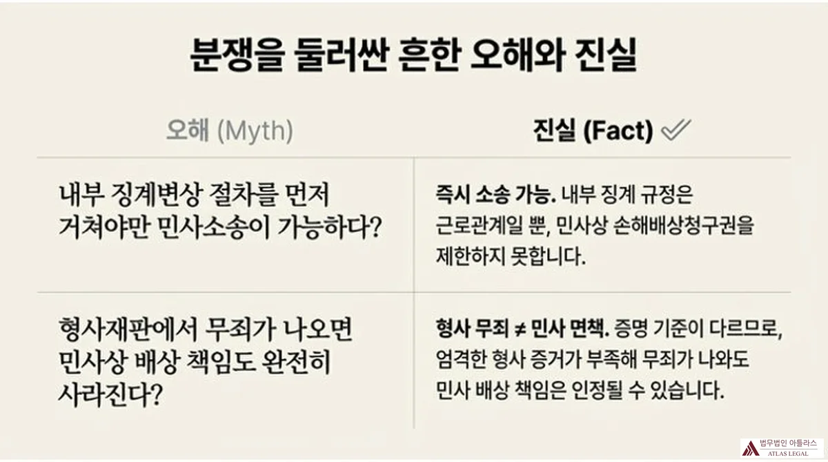 ![Atlas Legal - 부실대출 손해배상 분쟁 흔한 오해와 진실 (Myth vs Fact) 부실대출 분쟁을 둘러싼 흔한 오해와 진실: [오해1] 내부 징계변상 절차를 먼저 거쳐야만 민사소송이 가능하다? → [진실] 즉시 소송 가능. 내부 징계 규정은 근로관계일 뿐, 민사상 손해배상청구권을 제한하지 못함. [오해2] 형사재판에서 무죄가 나오면 민사상 배상 책임도 완전히 사라진다? → [진실] 형사 무죄 ≠ 민사 면책. 증명 기준이 다르므로 엄격한 형사 증거가 부족해 무죄가 나와도 민사 배상 책임은 인정될 수 있음.](https://atlaw.kr/kr-blog/wp-content/uploads/sites/2/2026/04/fl20260406-12.webp)