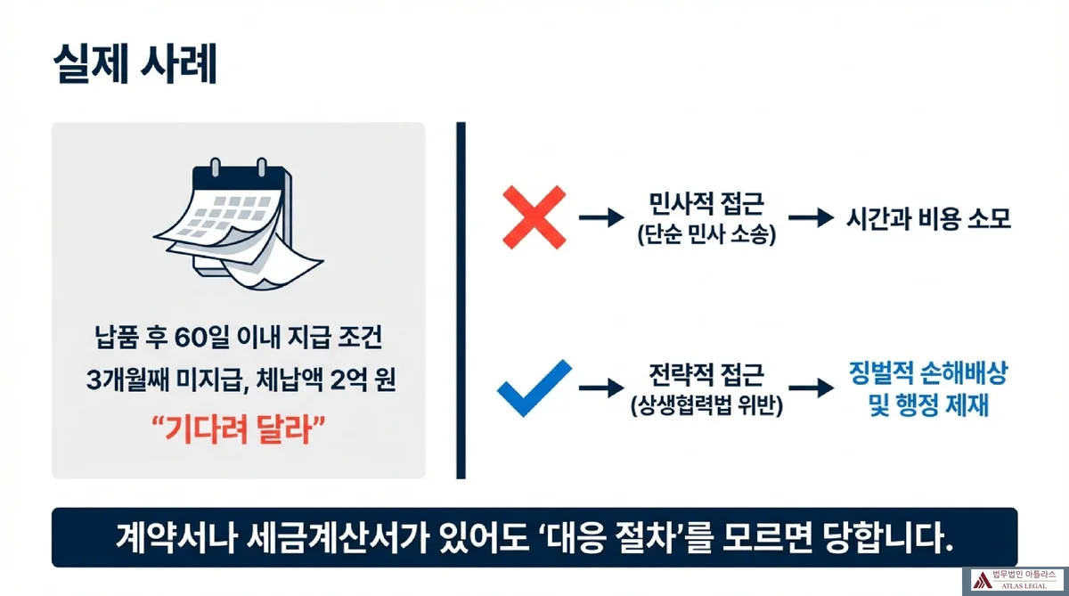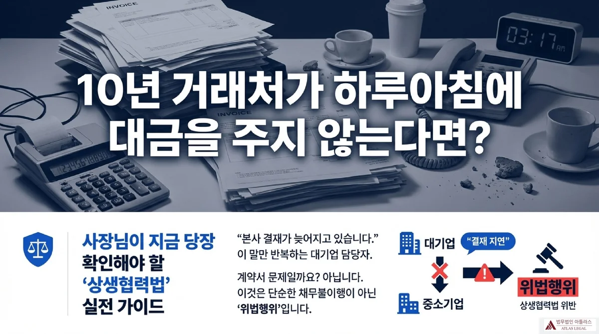 10년 넘게 부품을 납품해온 중소 제조업체 대표가 사무실을 찾아왔습니다. 거래처인 대기업 계열사가 3개월째 납품대금 2억 원을 지급하지 않는다는 것이었습니다. 계약서에는 납품 후 60일 이내 지급이라고 명시되어 있었는데, 담당자는 “본사 결재가 늦어지고 있다”는 말만 반복했습니다. 이 경우 상생협력법으로 대응할 수 있을까요?