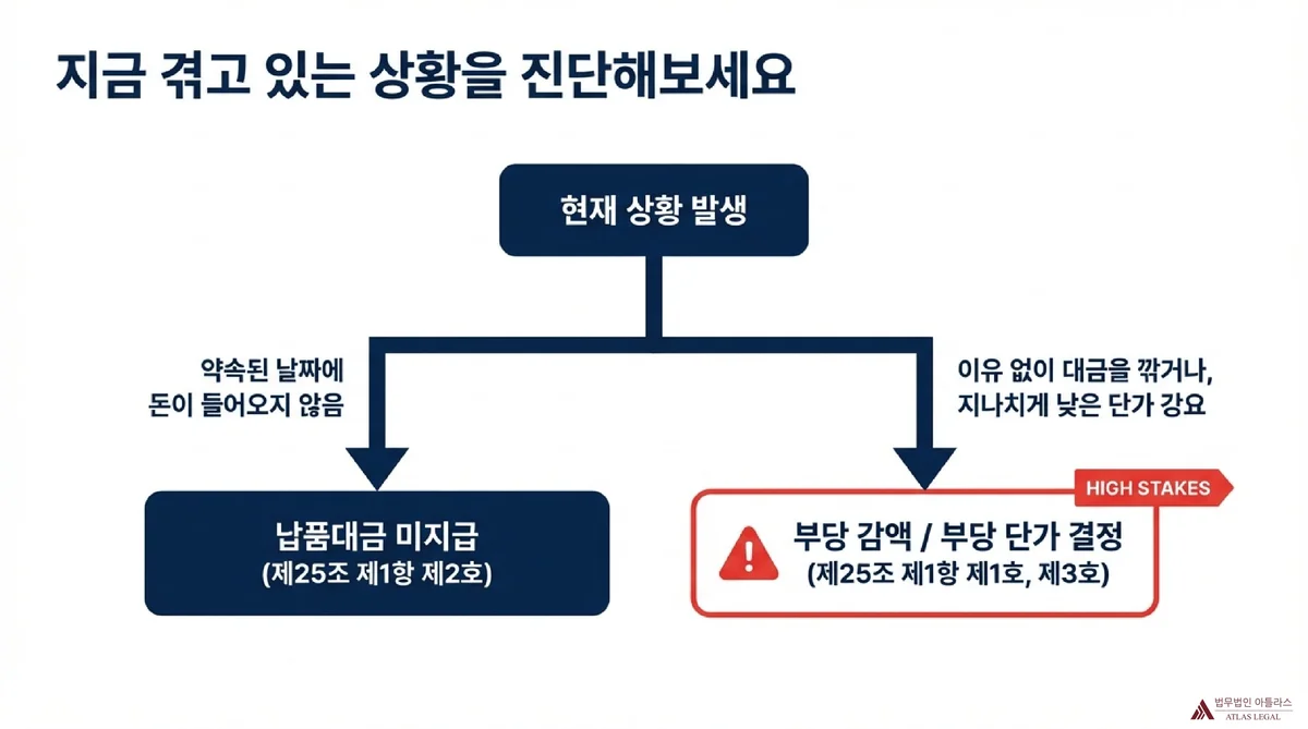 납품대금 미지급(제25조 제1항 제2호)과 납품대금 감액(같은 항 제1호)은 모두 상생협력법 위반이지만, 수탁기업이 받을 수 있는 손해배상의 성격과 규모에서 중요한 차이가 있습니다. 이 구분을 정확히 이해해야 효과적인 대응 전략을 세울 수 있습니다.