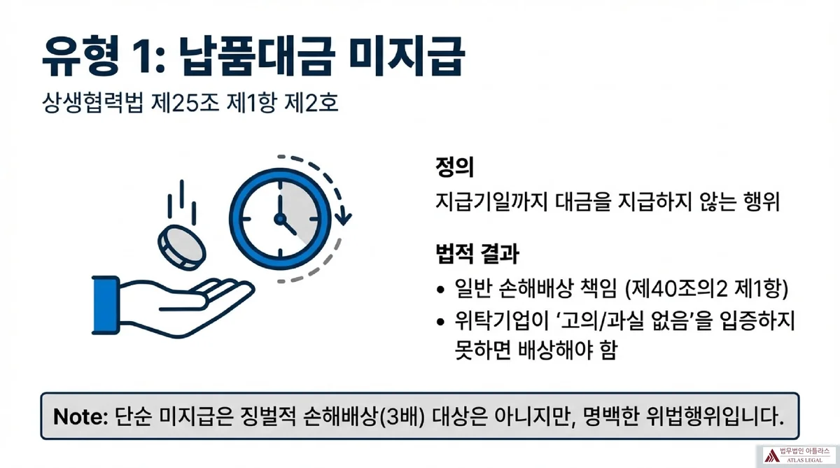 대·중소기업 상생협력 촉진에 관한 법률 제25조 제1항은 위탁기업이 수탁기업에 물품 등의 제조를 위탁할 때 해서는 안 되는 행위들을 열거하고 있습니다. 납품대금 미지급과 관련해서는 크게 세 가지 유형이 규정되어 있습니다.