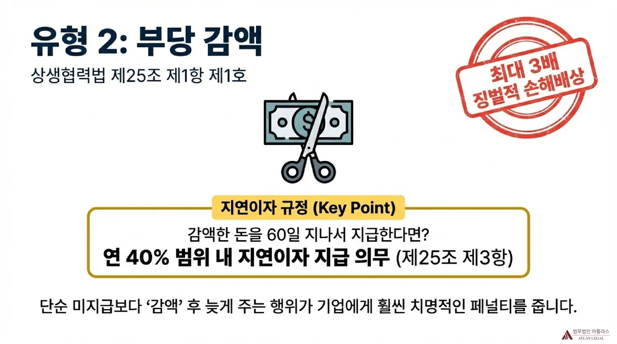 상생협력법 제25조 제3항은 감액 위반(제1항 제1호)과 관련하여 특별한 이자 규정을 두고 있습니다. 위탁기업이 제1호의 행위(납품대금 감액)를 통해 감액한 납품대금을 물품 등의 수령일부터 60일이 지난 후 지급하는 경우에는, 그 초과기간에 대하여 연 100분의 40 이내의 범위에서 대통령령으로 정하는 이율에 따른 이자를 지급해야 합니다.