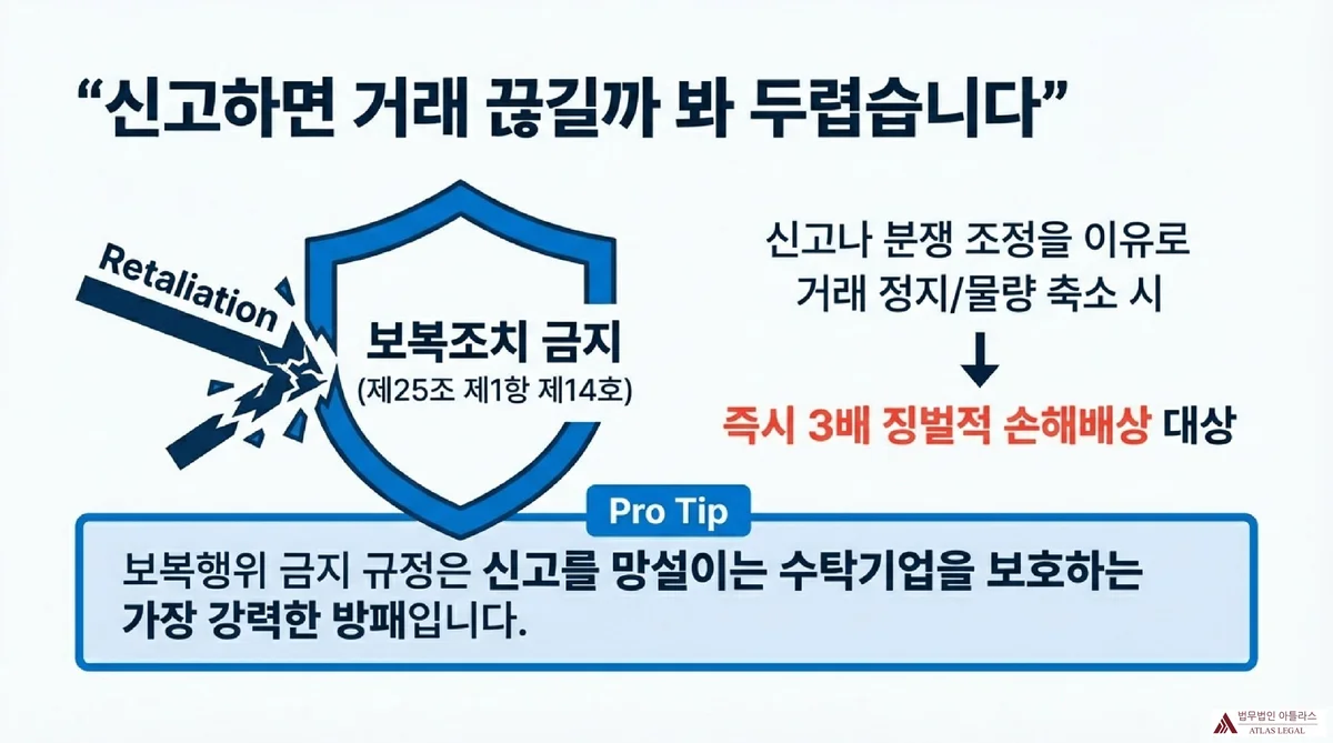 수탁기업이 신고를 망설이는 가장 큰 이유는 거래관계가 끊길 것에 대한 두려움입니다. 그러나 상생협력법 제25조 제1항 제14호는 수탁기업이 금지행위 사실을 관계 기관에 고지하거나 분쟁 조정을 신청한 것을 이유로 거래물량 감소, 거래 정지 등 불이익을 주는 행위를 별도로 금지하고 있으며, 이는 3배 이내의 징벌적 손해배상(제40조의2 제2항 제1호) 대상이기도 합니다.