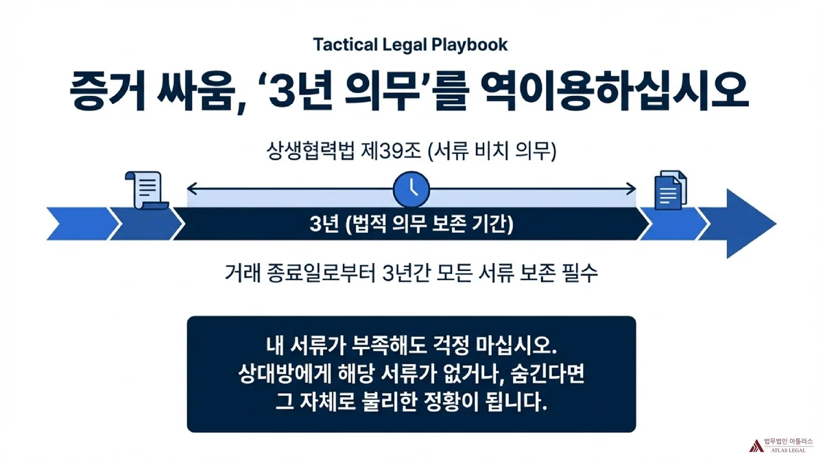 상생협력법 제39조 및 동법 시행규칙 제11조는 위탁기업과 수탁기업 모두에게 납품대금의 지급 및 수령에 관한 서류를 거래 종료일부터 3년간 비치할 의무를 부과합니다. 이는 의무 규정이지만, 수탁기업 입장에서는 본인이 보관해야 하는 서류 목록을 역으로 파악하는 기준이 되기도 합니다.