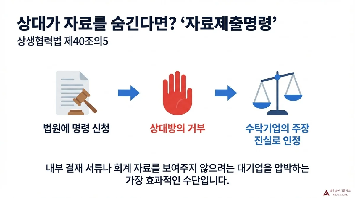 수탁기업이 단독으로 위탁기업의 내부 자료를 확보하기 어려운 경우, 소송 과정에서 법원에 자료제출명령을 신청하는 방법이 있습니다. 상생협력법 제40조의5 제1항은 법원이 당사자의 신청에 따라 상대방에게 위반행위의 존재 여부 증명 또는 손해액 산정에 필요한 자료의 제출을 명할 수 있도록 규정합니다. 위탁기업이 정당한 이유 없이 이에 따르지 않으면 법원은 해당 자료의 기재에 관한 수탁기업의 주장을 진실한 것으로 인정할 수 있습니다(제40조의5 제4항).