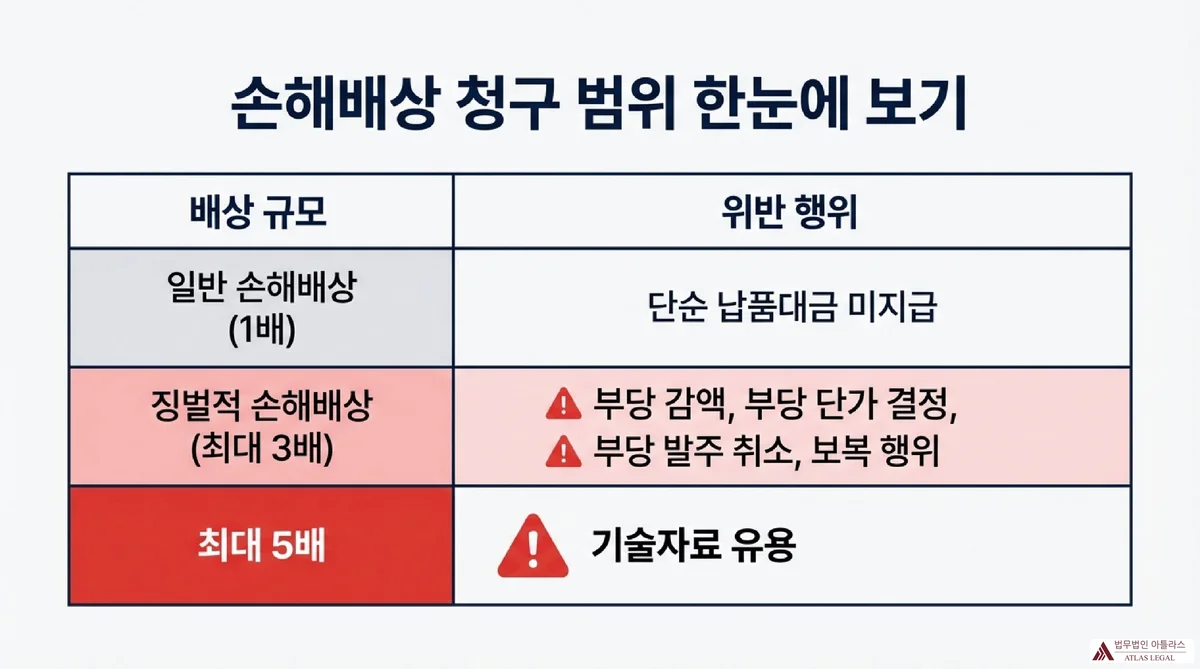 상생협력법상 손해배상은 위반행위의 유형에 따라 일반 손해배상과 징벌적 손해배상으로 나뉩니다. 수탁기업 입장에서는 위탁기업의 어떤 행위가 문제인지를 정확히 파악하여 청구 범위를 결정해야 합니다.