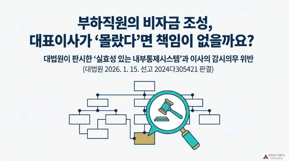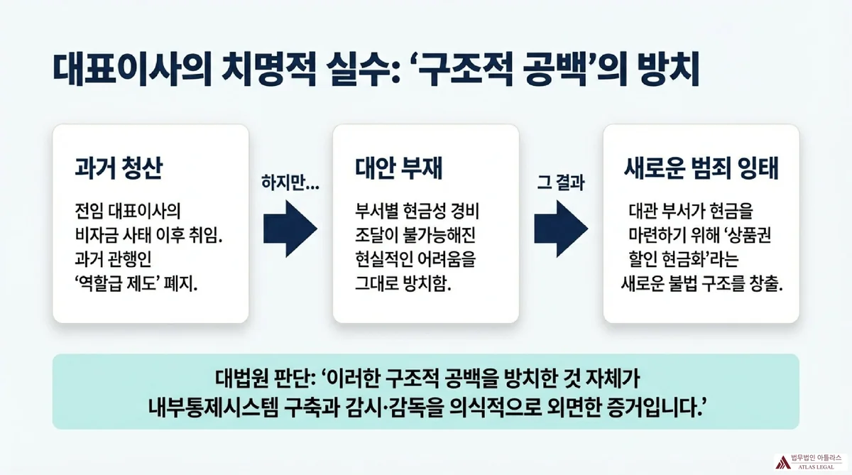 둘째, 전임 대표이사의 비위로 퇴임이 이루어진 직후 취임하는 경우, 취임 초기에 조직 전체의 위법 위험 영역을 전수 점검하고 통제 시스템을 재정비하는 작업이 필수적입니다. 이 사건에서는 역할급 폐지라는 조치만 취하고 그로 인한 구조적 공백을 방치한 것이 결정적인 문제였습니다.