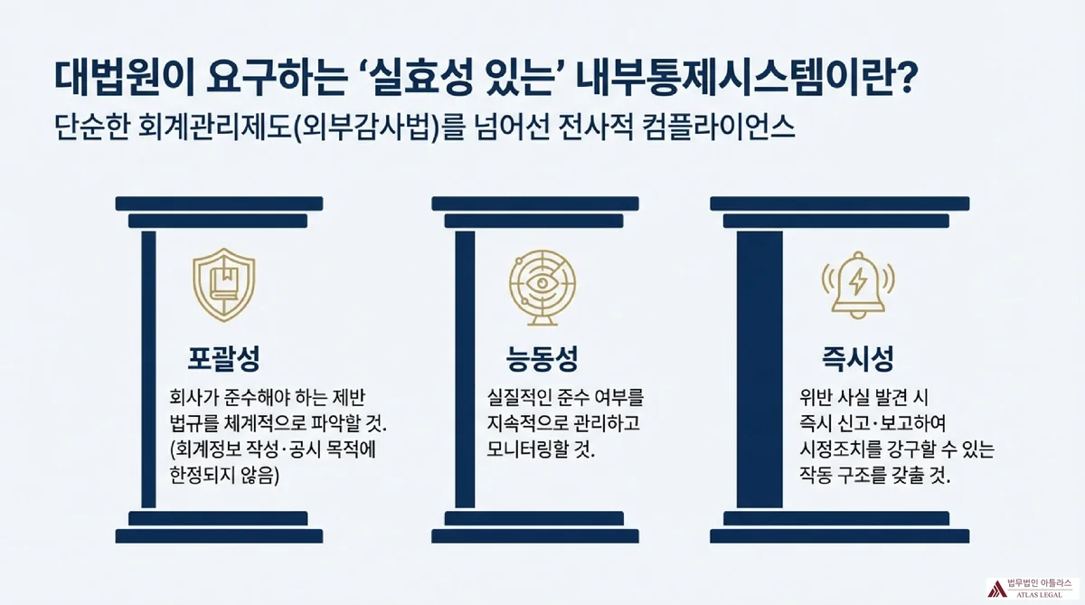 대법원은 이 판결에서 내부통제시스템의 의미와 요건을 구체적으로 제시했습니다. 회계관리제도에 국한하지 않고, 회사가 준수해야 하는 제반 법규를 체계적으로 파악하여 그 준수 여부를 관리하고, 위반사실 발견 시 즉시 신고·보고하여 시정조치를 강구할 수 있는 형태로 구현되어야 한다고 명시했습니다(대법원 2026. 1. 15. 선고 2024다305421 판결).