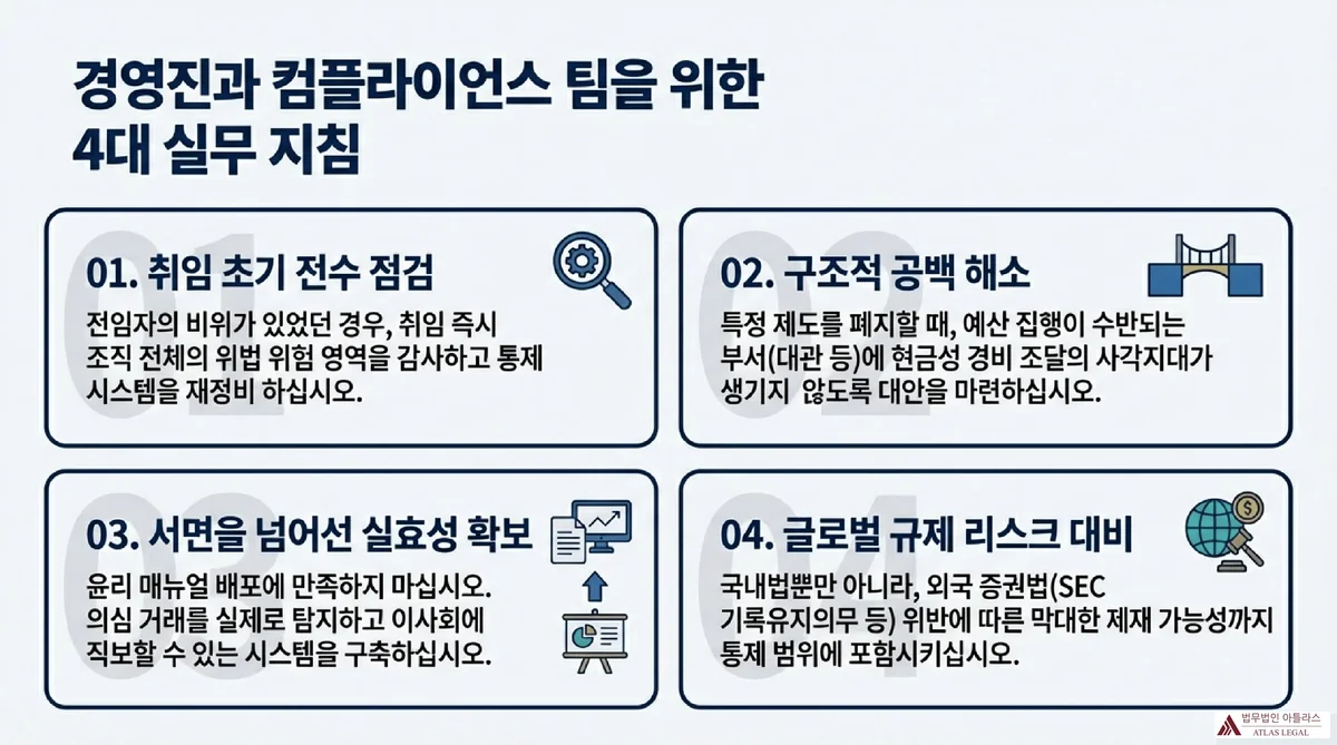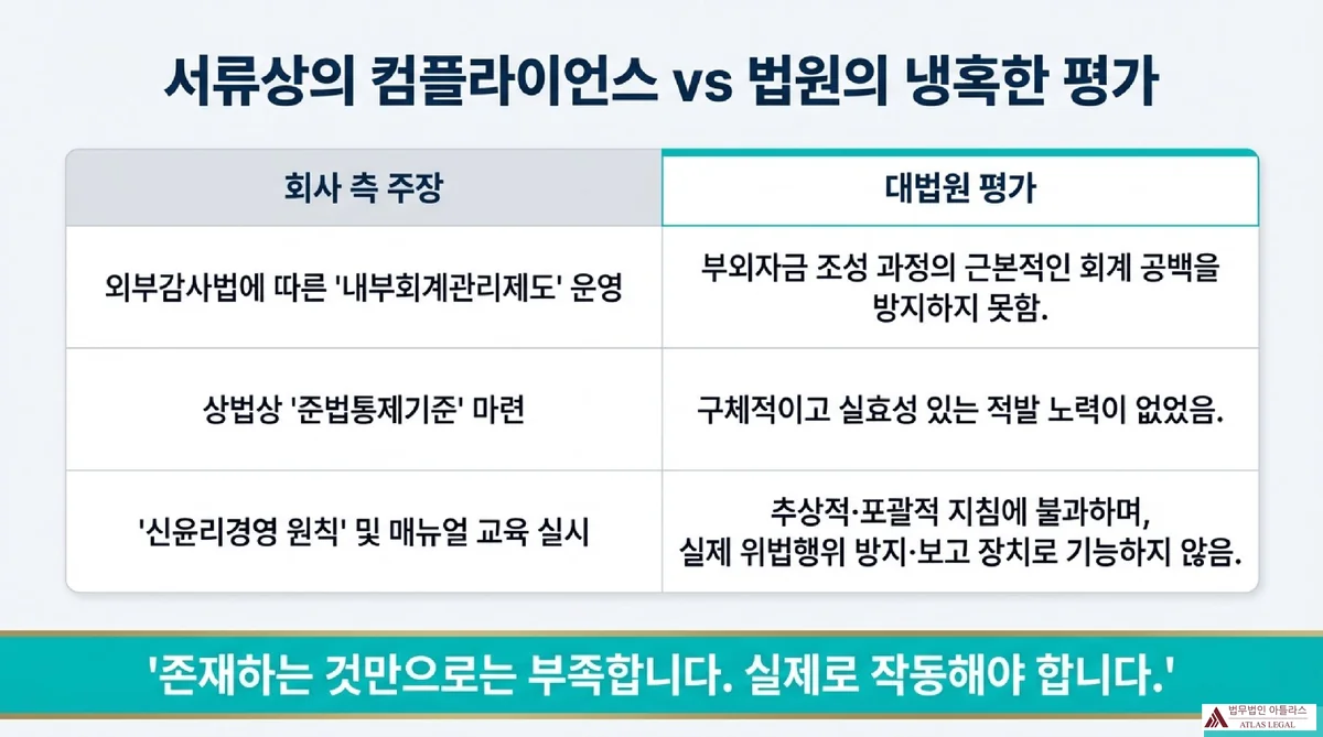 첫째, 컴플라이언스 프로그램은 서면으로 존재하는 것으로 충분하지 않습니다. 실제로 위법행위를 탐지하고 보고·통제할 수 있는 작동 구조를 갖추어야 합니다. 이 판결에서 윤리경영 교육이나 준법통제기준이 있었음에도 책임이 인정된 이유는 그것이 실효적으로 작동하지 않았기 때문입니다.