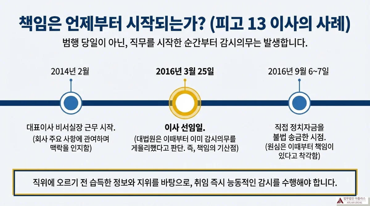 원심은 피고 13이 2016. 9. 6. 직접 정치자금을 송금한 다음 날인 2016. 9. 7.부터 감시의무 위반이 시작된다고 보았습니다. 그러나 대법원은 피고 13이 이사로 선임된 2016. 3. 25.경부터 이미 이 사건 부외자금 조성과 관련한 감시의무를 게을리하였다고 볼 여지가 있다고 판시했습니다. 피고 13은 이사 선임 전인 2014년 2월부터 피고 2 밑에서 비서실장으로 근무하며 회사 주요 사항에 관여하는 위치에 있었다는 점도 고려 요소였습니다.