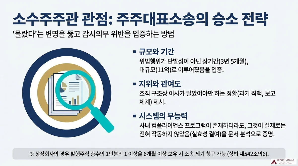 판례 분석과 실무 경험을 바탕으로 보면, 내부통제시스템의 실효성 여부는 소송에서 사실 인정의 핵심이 됩니다. 이사회 의사록, 컴플라이언스 프로그램 문서, 내부감사 보고서, 준법통제 매뉴얼 등 관련 자료를 사전에 면밀히 검토하여 소송 전략을 수립해야 합니다.