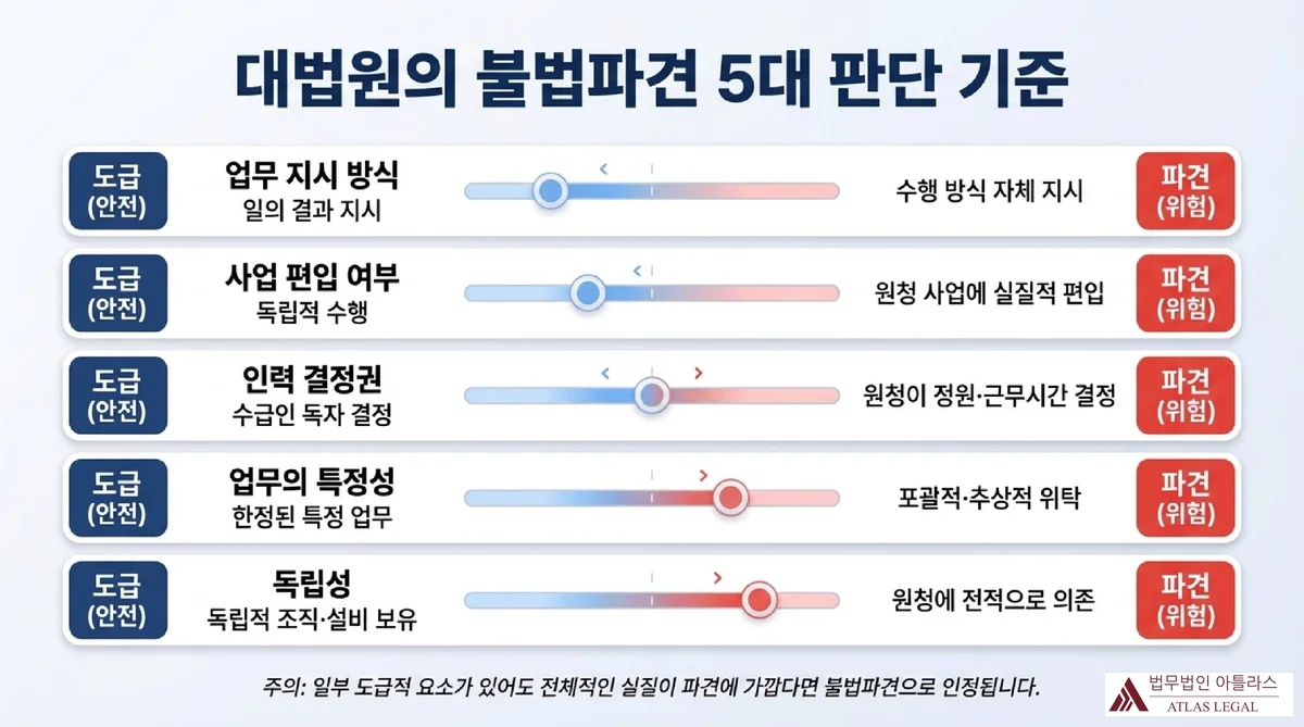 대법원의 불법파견 5대 판단 기준을 슬라이더 그래프로 시각화한 인포그래픽. 업무 지시 방식, 사업 편입 여부, 인력 결정권, 업무의 특정성, 독립성의 5개 항목별로 도급(안전)과 파견(위험) 사이의 위험도를 표시
