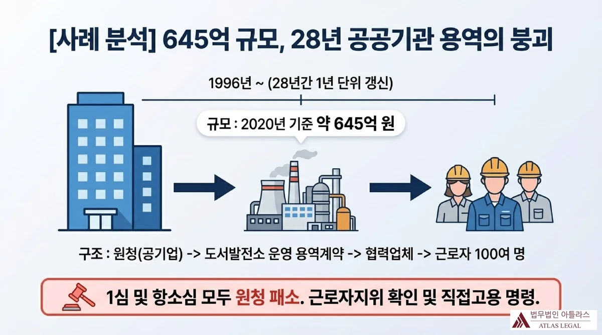 공기업이 협력업체에 도서발전소 운영 용역을 위탁하고 협력업체가 근로자 100여 명을 배치한 구조를 도식화한 인포그래픽. 1996년부터 28년간 운영된 645억 원 규모의 용역이 1심과 항소심 모두 원청 패소로 끝났음을 표시