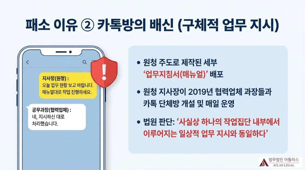 패소 이유 두 번째: 원청 지사장이 협력업체 공무과장에게 카카오톡으로 업무 지시를 하는 장면을 스마트폰 화면으로 표현. 원청 주도 업무지침서 배포와 카카오톡 단체방을 통한 일상적 업무 지시가 파견의 지표로 판단된 내용 설명