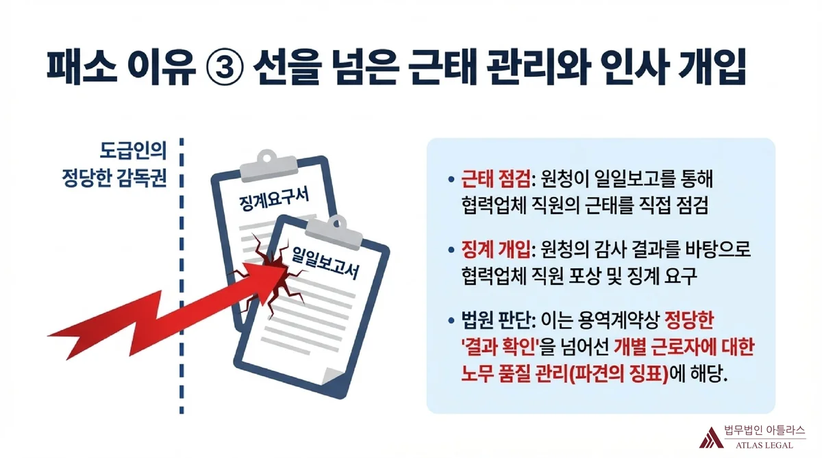 패소 이유 세 번째: 협력업체 직원 근태점검과 징계요구서가 파견의 징표로 판단된 내용을 일일보고서와 징계요구서 문서 아이콘으로 시각화. 근태 점검, 징계 개입, 법원 판단 세 가지를 불릿으로 설명