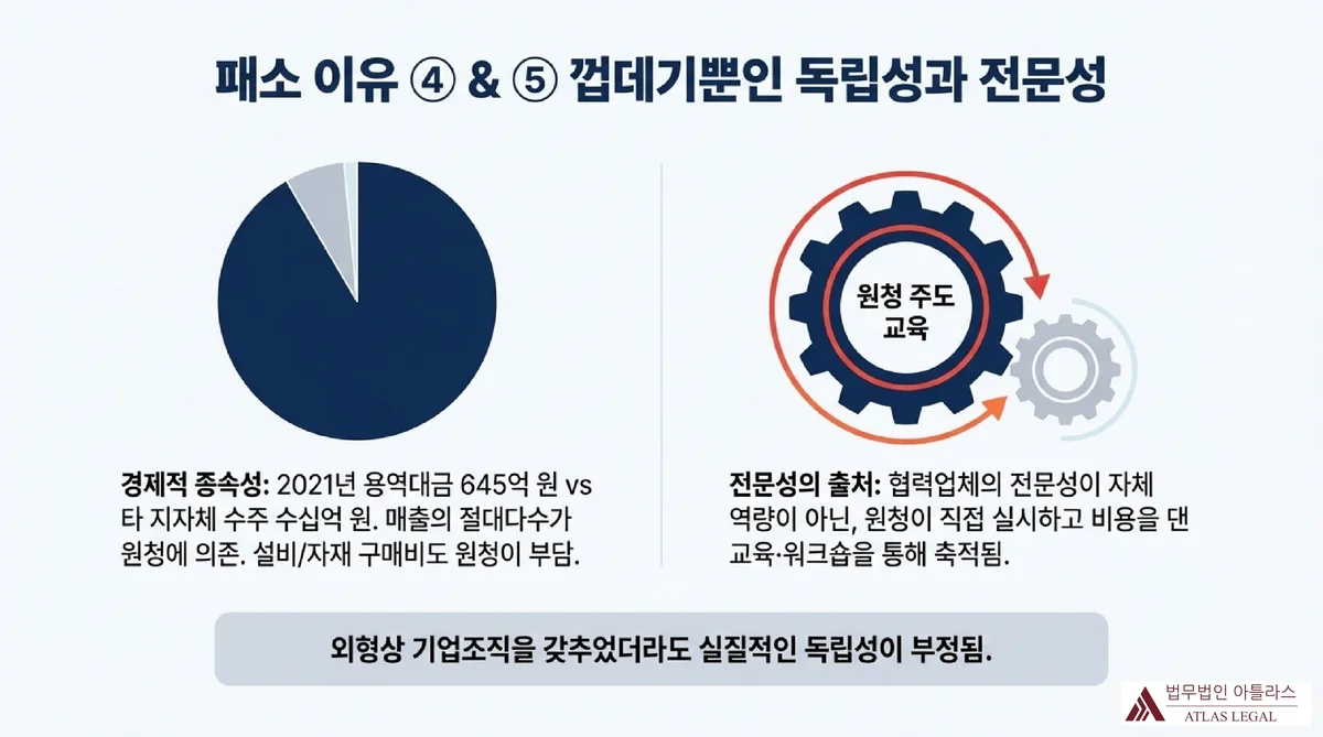 패소 이유 네 번째와 다섯 번째: 협력업체의 경제적 종속성을 원형 파이차트로, 전문성이 원청 주도 교육에서 비롯됨을 기어 아이콘으로 시각화. 외형상 기업조직을 갖추었더라도 실질적 독립성이 부정된다는 결론