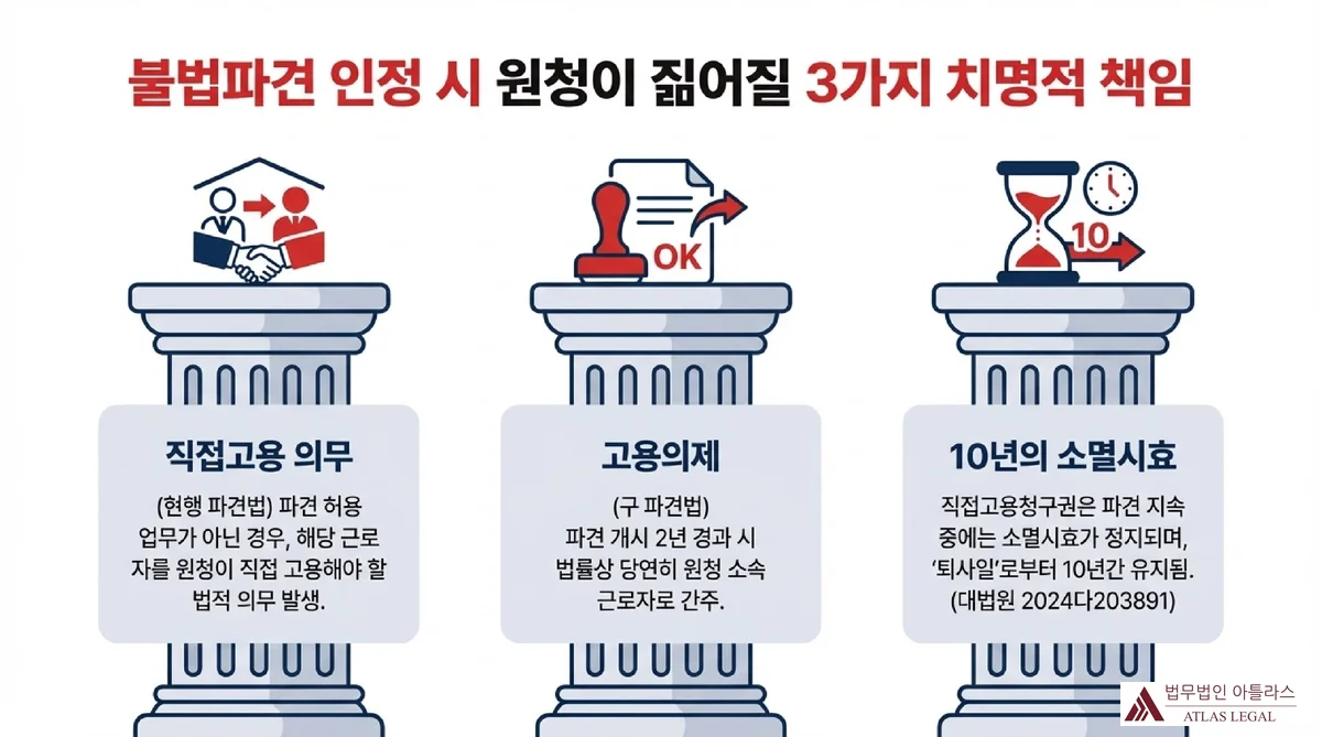 불법파견이 인정되었을 때 원청이 부담하는 법적 결과는 크게 세 가지입니다.