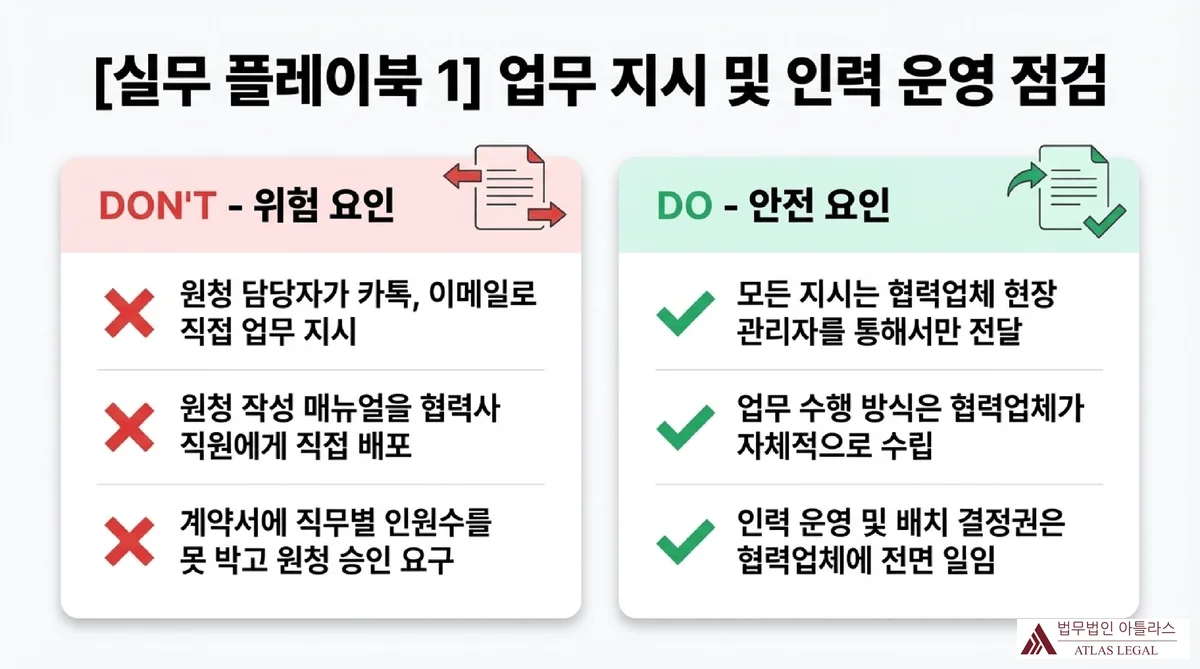 실무 플레이북 1: 업무 지시 및 인력 운영 점검 체크리스트. 위험 요인(DON'T)으로 원청 담당자의 직접 업무 지시, 원청 작성 매뉴얼 직접 배포, 계약서의 인원수 기재 후 원청 승인 요구를 제시하고 안전 요인(DO)으로 협력업체 관리자 통해 지시, 자체 업무방식 수립, 인력 결정권 전면 위임을 제시