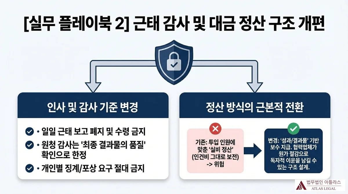 실무 플레이북 2: 근태 감사 및 대금 정산 구조 개편 방법. 일일 근태보고 폐지, 원청 감사를 최종 결과물 품질 확인으로 한정, 개인별 징계·포상 요구 금지 등 인사 및 감사 기준 변경과 성과·결과물 기반 보수 지급으로 정산 방식 전환을 설명