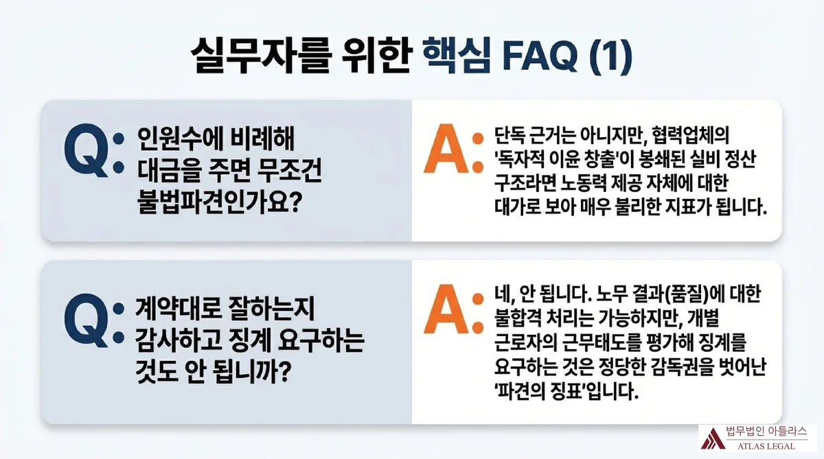 이번 판결이 기업 실무에 주는 가장 큰 시사점은 “계약서에 도급이라고 쓰여 있다고 안심할 수 없다”는 것입니다. 법원은 계약의 명칭이 아니라 실제 운영 방식의 실질을 봅니다. 판결의 논리를 역으로 활용하면 불법파견 리스크를 체계적으로 관리할 수 있습니다.