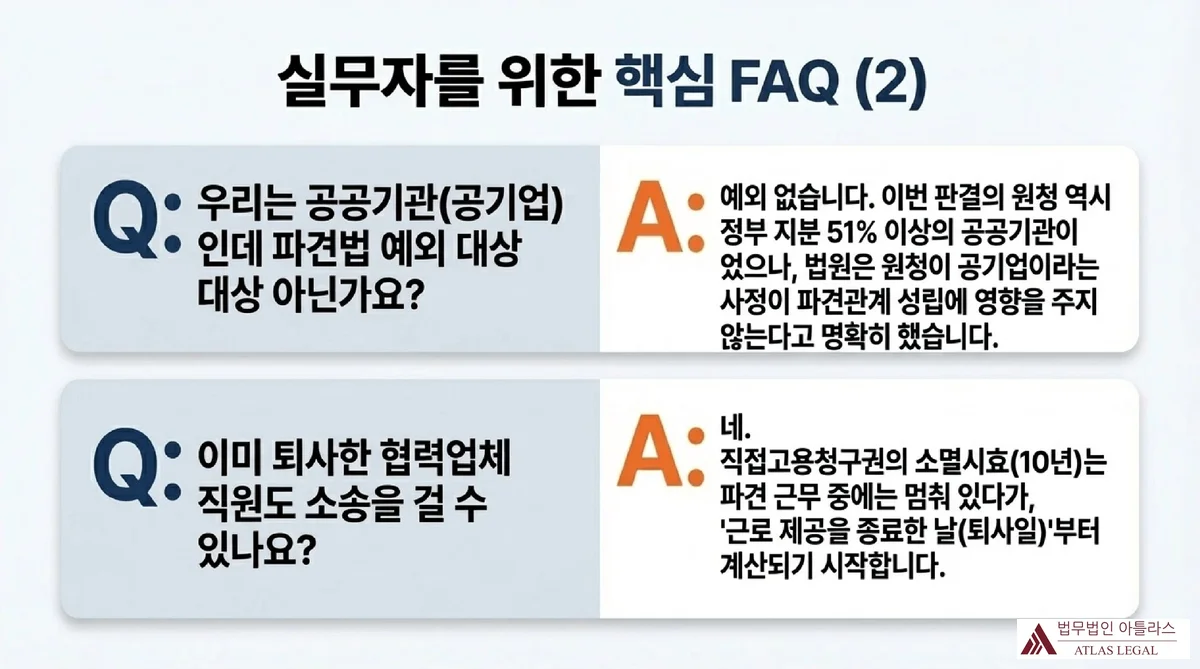 A. 네. 파견법은 공공기관·공기업에도 동일하게 적용됩니다. 이번 판결의 원청은 정부가 51% 이상 지분을 보유한 공공기관이었음에도 불구하고 법원은 파견법상 직접고용의무의 발생을 인정했습니다. 원청이 공기업이라는 사정이 파견관계 성립 여부에 영향을 주지 않는다고 명확히 했습니다.
