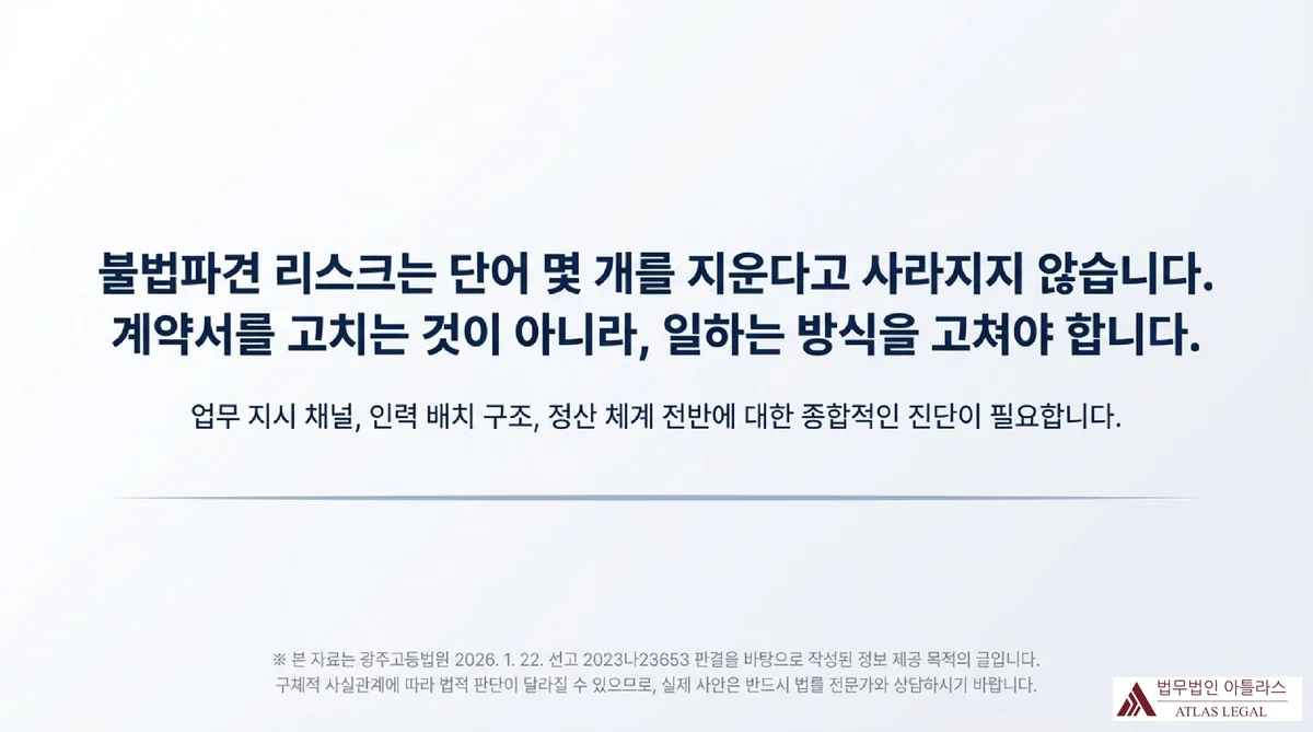 핵심 답변: 도급계약이라도 원청이 협력업체 근로자에 대해 구속력 있는 업무 지시, 인력 배치권 행사, 근태 감사·징계 요구를 한 경우 법원은 실질을 근로자파견으로 봅니다. 광주고등법원 2026. 1. 22. 선고 2023나23653 판결이 이를 명확히 했습니다.