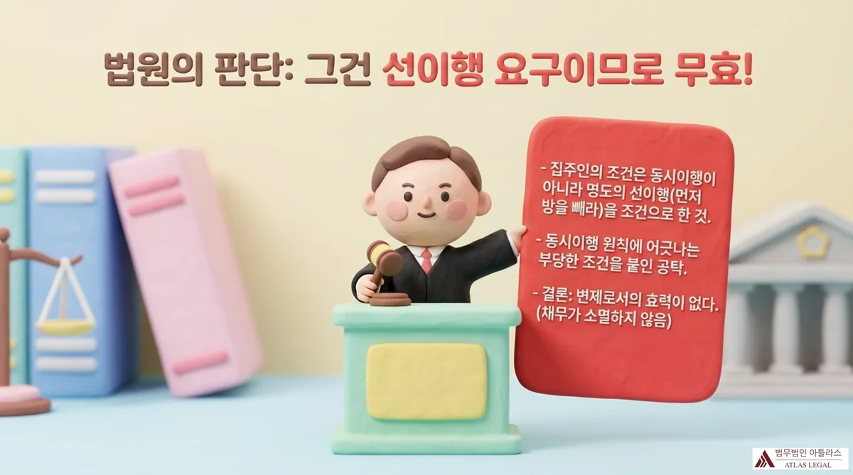 Y는 “X가 부동산 인도와 임차권등기 말소를 조건으로 공탁하여 무효이고, X가 열쇠 수령을 거부하였다”고 주장하였으나, 법원은 이를 받아들이지 않았습니다. 그 이유는 ① 조정에서 정한 동시이행 관계에 있는 반대급부를 조건으로 하였고, ② 이는 선이행 요구가 아니라 동시이행 조건이기 때문입니다(인천지방법원 2019가단272304 판결 참조; 대법원 1991. 12. 10. 선고 91다27594 판결; 대법원 1992. 12. 22. 선고 92다8712 판결 참조).
