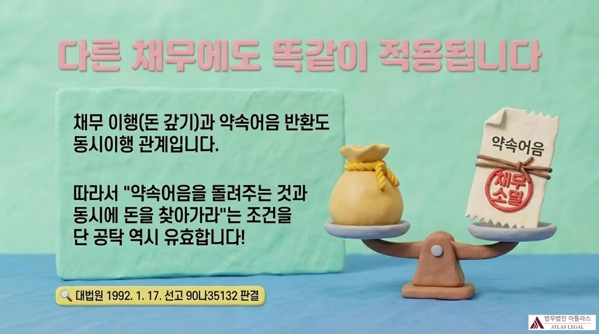 또한 약속어음의 반환을 조건으로 한 변제공탁의 유효성에 관해서도, 채무의 이행확보를 위하여 어음을 발행한 경우 그 채무의 이행과 어음의 반환은 동시이행 관계에 있고, 동시이행 관계에 있는 반대급부를 조건으로 하는 변제공탁은 유효하다고 판시하였습니다(대법원 1992. 12. 22. 선고 92다8712 판결; 대법원 1964. 12. 15. 선고 64다1030 판결 등 참조).