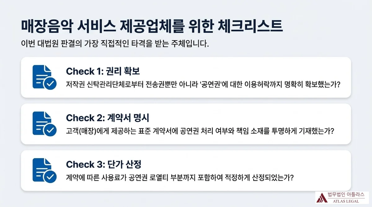 이번 판결의 직접적인 영향을 받는 것은 매장음악 서비스를 제공하는 업체들입니다. 서비스 업체는 다음을 점검해야 합니다. 첫째, 저작권 신탁관리단체로부터 공연권에 대한 이용허락을 확보했는지 확인합니다. 둘째, 고객 매장에 제공하는 계약서에 공연권 처리 여부를 명확히 기재합니다. 셋째, 계약에 따른 사용료가 공연권 부분까지 포함하여 적정하게 산정되어 있는지 검토합니다.