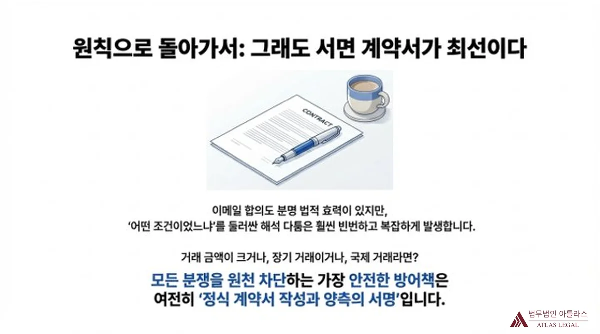 이메일 합의가 법적 효력을 가질 수 있다는 사실이 계약서 작성의 필요성을 없애지는 않습니다. 계약서는 분쟁 발생 시 계약 내용을 명확히 확인할 수 있는 가장 안전한 수단입니다. 특히 거래 금액이 크거나 계약 기간이 장기인 경우, 또는 국제 거래처럼 준거법이나 관할 조항이 중요한 경우에는 정식 계약서를 반드시 작성하고 양측의 서명을 받아두는 것이 필수적입니다. 실무에서 다수의 계약 분쟁 사건을 처리한 경험에 비추어 보면, 이메일 합의만으로 진행한 거래는 사후에 조건의 해석을 둘러싼 다툼이 더 자주, 더 복잡하게 발생합니다.