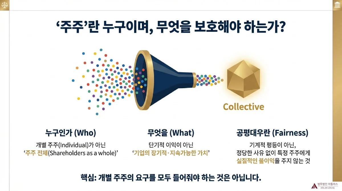 제2항 후단은 이사에게 전체 주주의 이익을 공평하게 대우할 의무를 부과합니다. 가이드라인은 여기서 ‘전체 주주’가 공평대우의 대상이 되는 모든 주주(every shareholder), 각 주주(each shareholder)를 의미한다고 설명합니다. 제2항 전단이 “주주 전체에게 귀속되는 몫을 극대화하라”는 의미라면, 제2항 후단은 “그것이 주주들 사이에서 공평하게 분배되어야 한다”는 의미입니다.