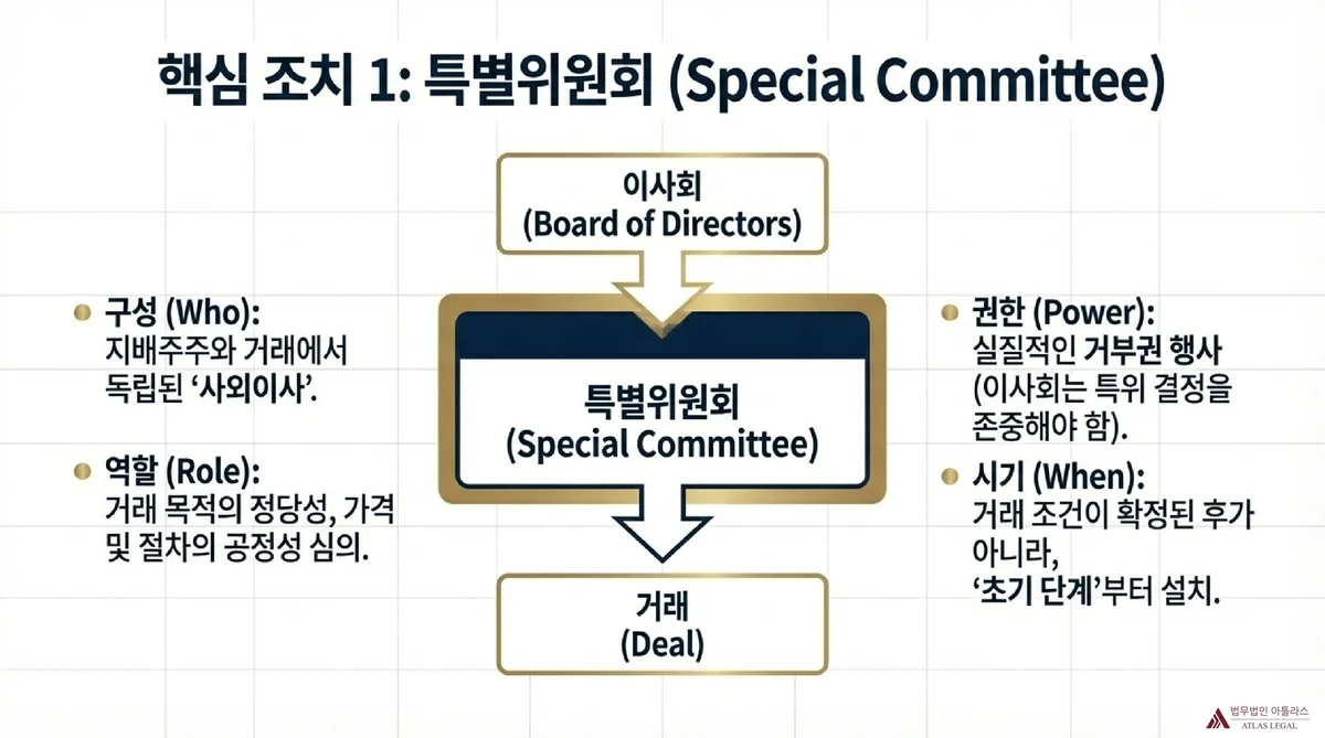 구조적 이해상충과 정보 비대칭으로 인하여 이사회 판단의 독립성이 문제되는 상황에서는, 해당 거래와 이해관계가 없는 독립적인 사외이사 등으로 특별위원회를 구성하여 거래 목적의 정당성, 거래 조건의 공정성, 거래 절차의 적절성을 검토하도록 하는 방안을 고려할 수 있습니다. 특별위원회는 법령상 기관이 아니라 이사회가 자율적으로 구성하는 임의적 기구입니다.