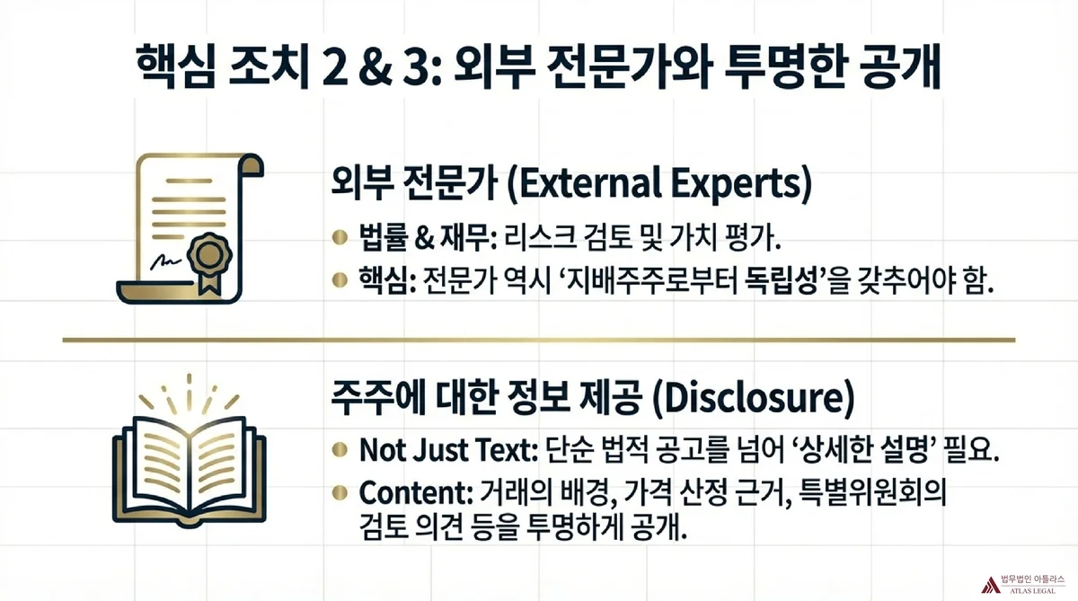 전문성과 독립성을 갖춘 외부전문가를 선임하여 거래의 구조, 절차, 조건의 공정성 등에 대한 검토를 수행하게 하는 방안입니다. 검토의 관점은 특정 주주가 아니라 회사와 주주 전체의 이익을 보호하는 것이어야 합니다.