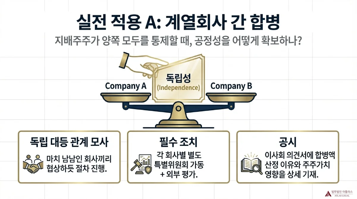 | 계열회사 간 합병 | 합병가액 불공정으로 인한 일방 주주 손해 | 총주주 이익 보호 / 주주 공평대우 / 장기 기업가치 관점 판단 | 특별위원회 구성 / 독립적 외부전문가 / 이사회 의견서 충실 공시 |