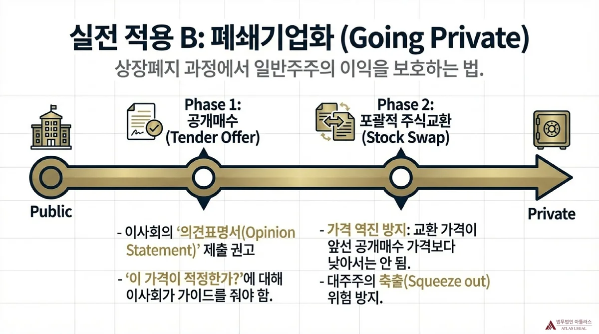 | 폐쇄기업화(공개매수 단계) | 정보 비대칭 / 매도압력 | 총주주 이익 보호 / 공개매수 가격 공정성 검증 | 의견표명서 제출(자본시장법 제138조) / 독립적 재무전문가 가치평가 |