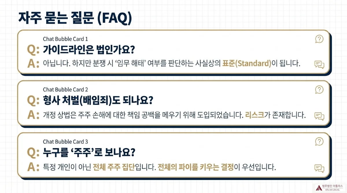 실제 상황: 2025년 7월, 기업 M&A 실무자들 사이에서 긴장감이 흘렀다. 상법이 개정되어 이사의 충실의무 대상이 ‘회사’에서 ‘회사 및 주주’로 확대되었기 때문이다. 합병을 추진하는 이사들은 물었다. “이제 주주 한 명 한 명의 이익까지 챙겨야 하는 건가요? 어디까지가 내 책임인가요?” 법무부가 이 질문에 답하는 가이드라인을 발표했다.