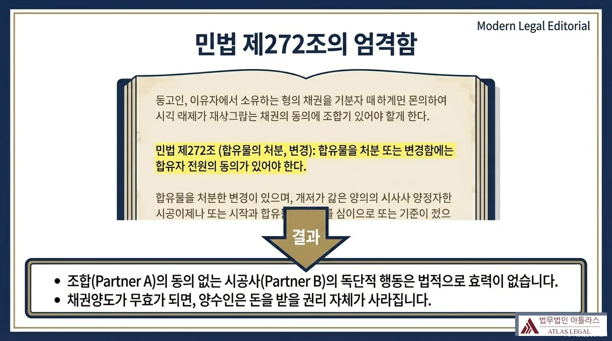 민법은 합유재산의 처분에 대해 엄격한 요건을 규정하고 있습니다. 합유재산을 처분하거나 변경하려면 합유자 전원의 동의가 필요하며, 개별 합유자는 자신의 지분도 단독으로 처분할 수 없습니다.