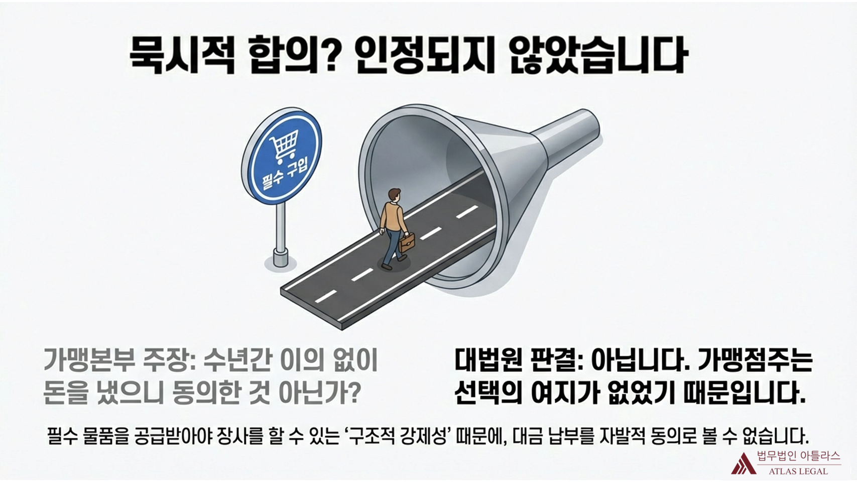 가맹본부 측은 가맹점사업자가 수년간 차액가맹금이 포함된 물품대금을 이의 없이 납부해왔으므로, 묵시적으로 차액가맹금 수취에 합의한 것으로 보아야 한다고 주장했습니다. 그러나 원심과 대법원 모두 이 주장을 받아들이지 않았습니다.