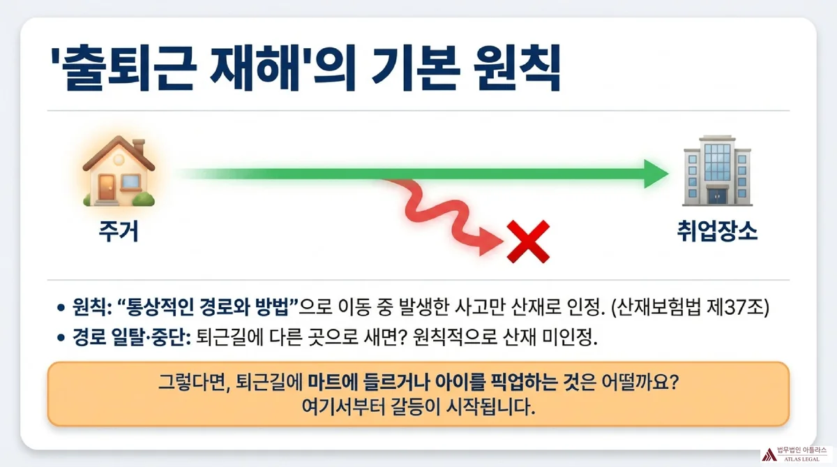 | 경로 일탈·중단 시 | 원칙적으로 출퇴근 재해 미인정 | 산재보험법 제37조 제3항 본문 |