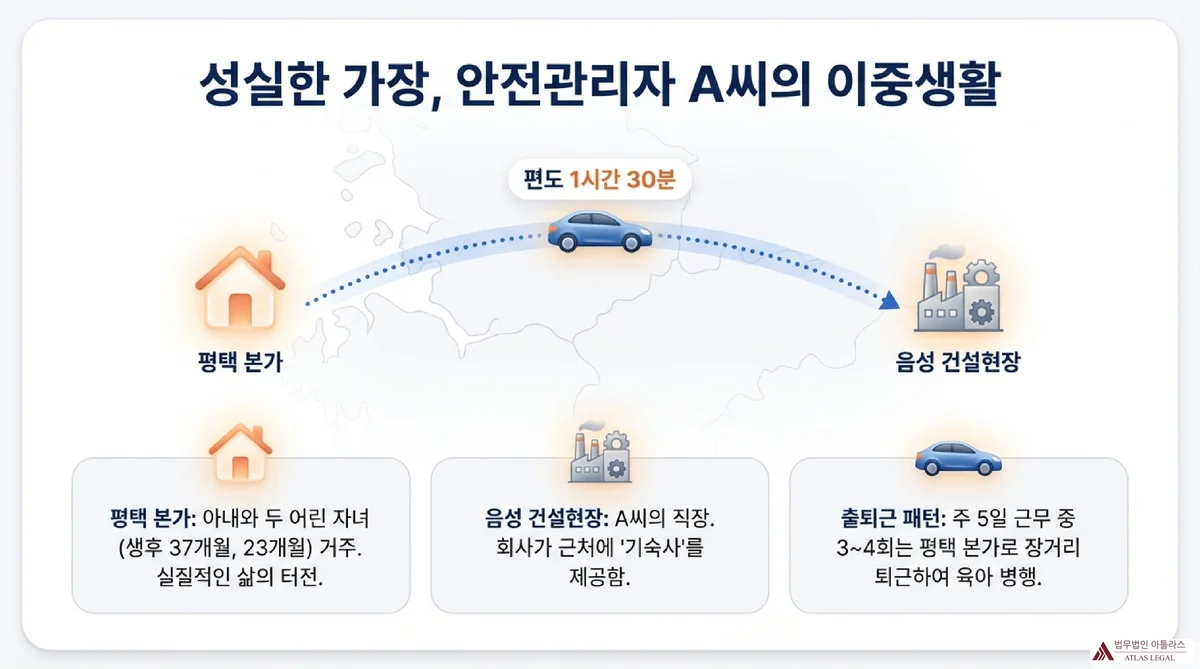 고인은 충북 음성군 소재 건설현장에서 안전관리 업무를 수행하던 근로자였습니다. 회사로부터 현장 근처에 있는 기숙사를 제공받았으나, 주 5일 중 3~4회는 경기 평택시에 있는 자택에서 직접 출퇴근하였습니다. 평택 자택에서 음성 현장까지는 편도 약 1시간 30분이 소요되는 장거리였습니다.