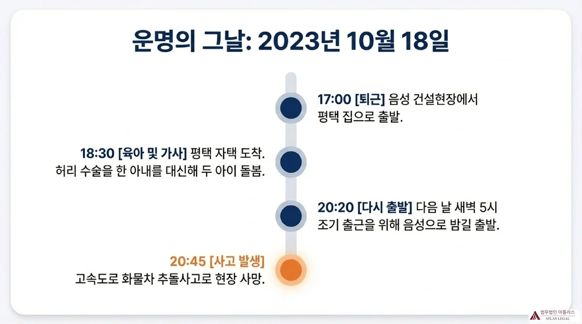 사고 당일인 2023년 10월 18일, 고인은 오후 5시 음성 현장에서 퇴근하여 오후 6시 30분 평택 자택에 도착하였습니다. 자택에서 두 명의 어린 자녀(사고 당시 생후 37개월, 23개월)를 돌보고 가사업무를 수행한 후, 다음날 조기출근을 위해 오후 8시 20분 자택을 출발하였습니다. 그런데 오후 8시 45분경 고속도로에서 화물차 추돌사고가 발생하였고, 고인은 그 자리에서 사망하였습니다.