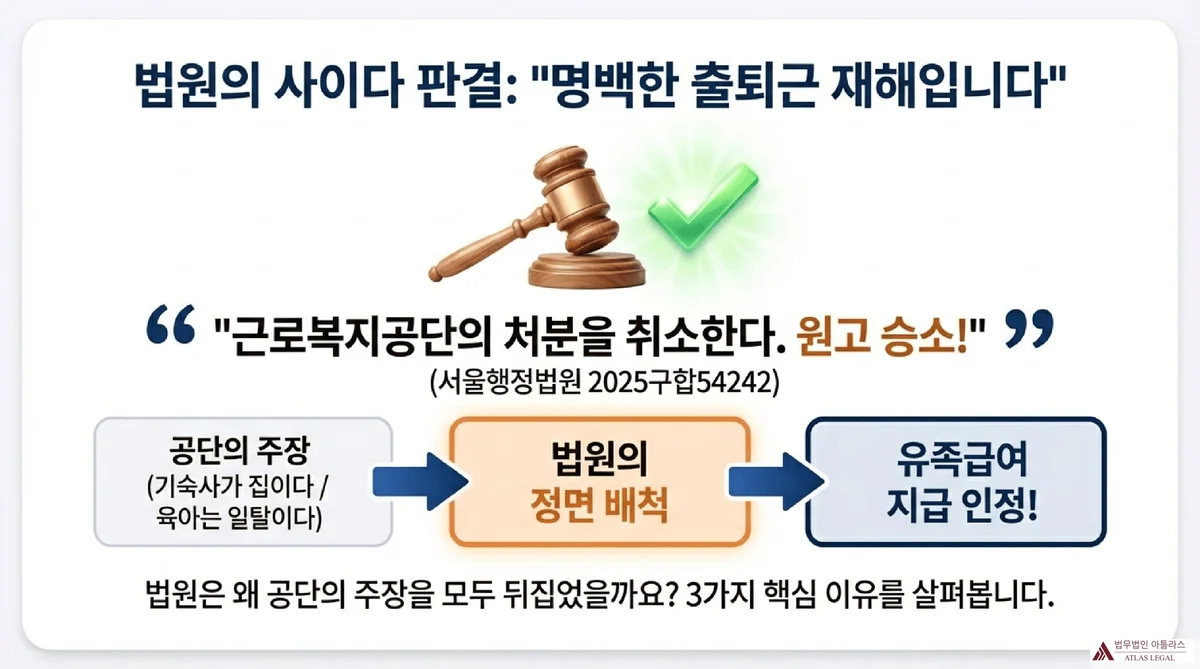 법원은 고인이 평소 주 5일 중 3~4회를 평택 자택으로 퇴근하고 곧바로 현장으로 출근하여 왔다고 지적하였습니다. 사고 당일에도 고인은 음성 현장에서 출발하여 1시간 30분을 운전해 평택 자택에 완전히 도착하였습니다. 법원은 “이 사건 사고 당일 고인의 퇴근 경로는 어떠한 경로 일탈이나 중단 없이 종결되었다”고 판시하였습니다(서울행정법원 2025구합54242 판결문 5면).