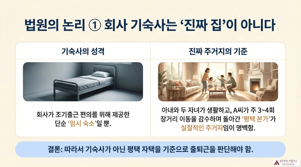 법원은 이 주장을 정면으로 배척하였습니다. “고인의 주된 주거는 평택 자택이고, 음성 기숙사는 조기 출근 등의 편의를 위하여 회사가 제공한 숙소일 뿐 고인이 실질적으로 거주하며 일상생활을 영위하는 주거로 볼 수 없다”고 명시하였습니다(판결문 5면).