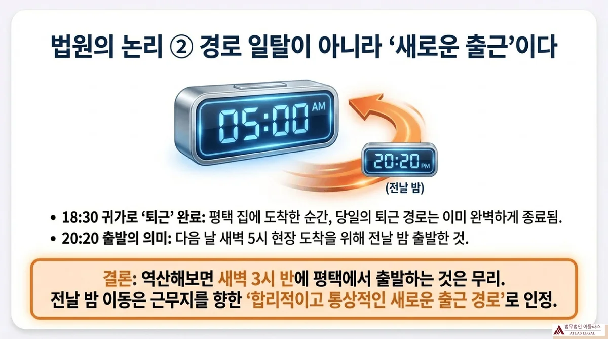 따라서 자택에서의 육아·가사는 퇴근 경로 중의 일탈이 아니라 퇴근을 완료한 후의 일상생활에 해당합니다. 오후 8시 20분 자택을 출발한 시점부터는 다음날 새벽 5시 조기출근을 위한 새로운 ‘출근’ 행위가 시작된 것입니다.