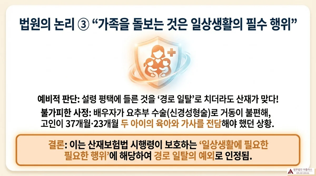법원은 고인이 자택에 들러 자녀를 돌보고 가사를 처리한 것이 “보호 아동을 보육기관에 데려주거나 의료기관 등에서 요양 중인 가족을 돌보는 행위에 준할 정도로 일상생활에 필요한 행위에 해당된다”고 판시하면서, 산재보험법 시행령 제35조 제2항 제7호에 따라 출퇴근 경로의 일탈이나 중단이 일상생활에 필요한 행위로서 출퇴근 재해에 해당하는 경우로 볼 수 있다고 하였습니다(서울행정법원 2025구합54242 판결문 5~6면).