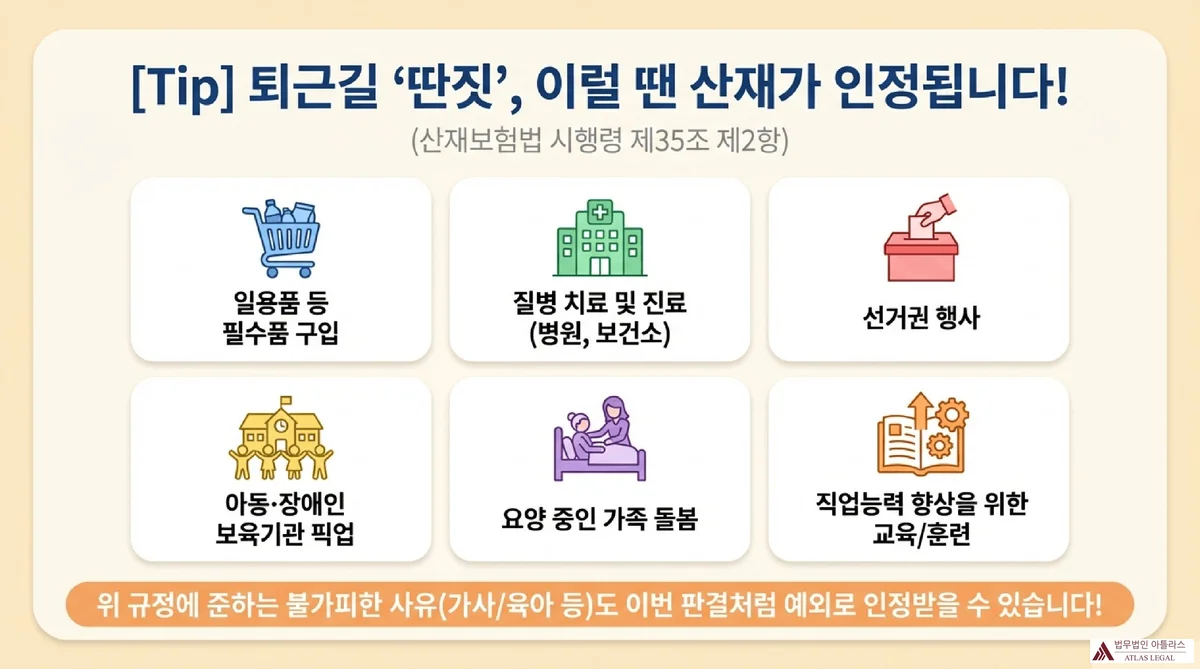 산재보험법 시행령 제35조 제2항은 출퇴근 경로 일탈·중단의 예외 사유를 열거하면서, 제7호에서 포괄적 위임 조항을 두고 있습니다. 이번 판결은 이 제7호를 활용하여 육아·가사를 예외 사유로 인정한 것으로, 실무적으로 중요한 의미를 가집니다.