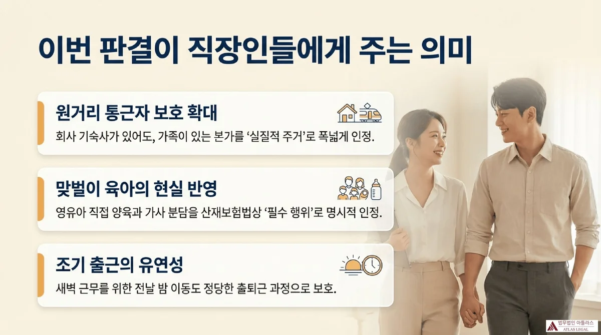 이번 판결은 원거리 근무와 육아를 병행하는 근로자의 출퇴근 재해 보호 범위를 실질적으로 확대하였다는 점에서 중요합니다. 특히 회사 기숙사를 단순 편의 숙소로 보아 실질적 주거에서 제외한 판단, 그리고 영유아 직접 양육을 시행령 제7호의 예외 사유로 인정한 판단은 향후 유사 사건에서 중요한 선례가 될 것입니다. 근로복지공단의 부지급 처분을 받으신 경우 각 요건에 맞는 구체적인 대응 전략 수립이 필요합니다.